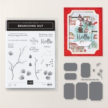 This week’s card showcases a beautiful blend of classic Christmas touches and rich, layered textures. The Branching Out Bundle brings those timeless pine branches to life, paired with the warm, elegant feel of the Regal Distressed Patterns Specialty DSP over a deep Cherry Cobbler base. Soft Very Vanilla Cardstock keeps everything cozy and traditional, while the Delicate Pines Dies add even more Gold Foil details in this design.